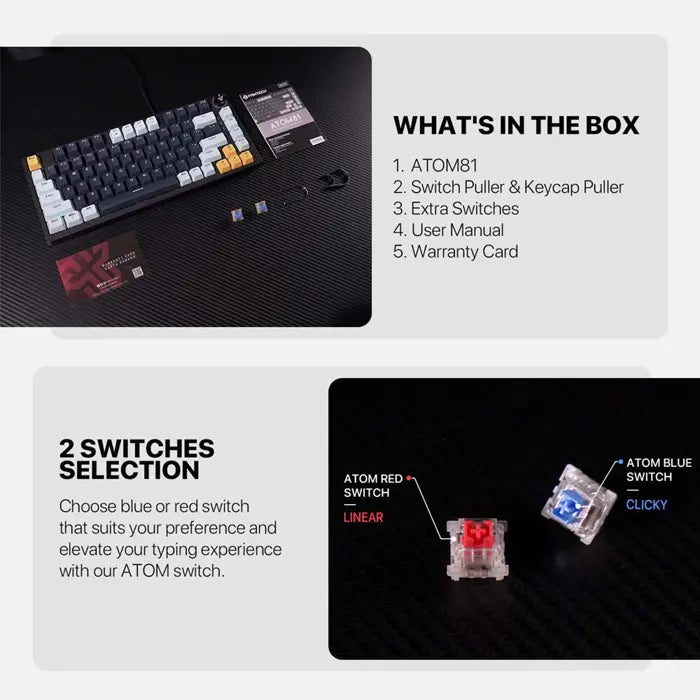 ATOM63 MK875v2 ima tipke s dvostrukim ubrizgavanjem tako da slova, brojke i drugi simboli budu postojani i neće lako izblijediti. Ova tipkovnica također ima 3 kombinacije boja tipki, tako da izgleda vrlo privlačno.